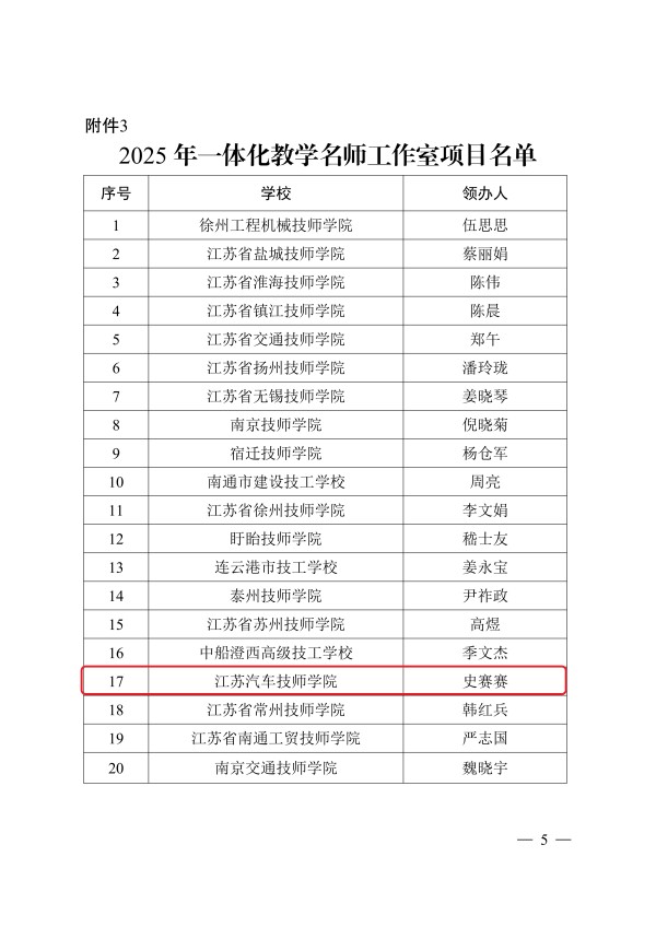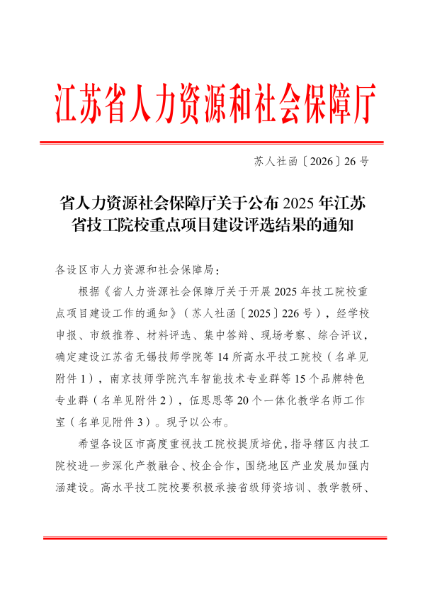 3月4日,江苏省人力资源和社会保障厅发布了《关于公布2025年江苏省技工院校重点项目建设评选结果的通知》(苏人社函〔2026〕26号),我校汽车工程学院教师史赛赛成为“一体化教学名师工作室”领办人。目前,学院已有省级一体化教学名师工作室3个,学院师资团队建设取得新突破。